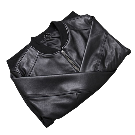 Men’s Black Genuine Sheepskin Rib Knit Slim-Fit Leather Bomber Jacket