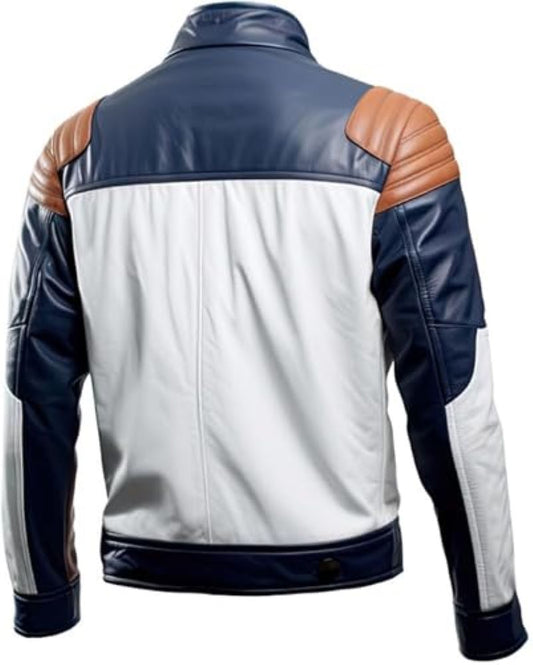 Men’s Blue White Genuine Sheepskin Leather Bomber Jacket