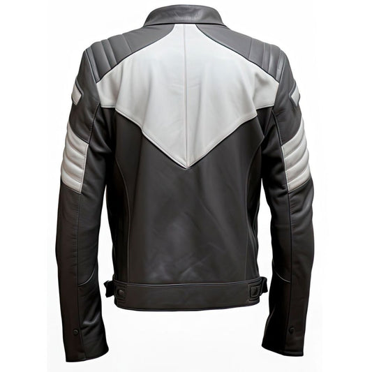 Men's Charcoal Grey White Sheepskin Moto Quilted Racer Leather Jacket