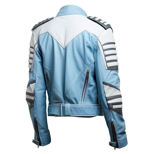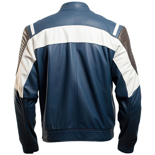Men’s Blue-White Biker Cafe Racer Genuine Sheepskin Leather Jacket