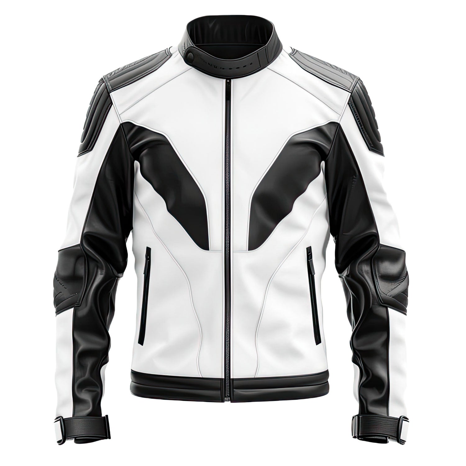 Presenting the Men's Black White Real Jacket Sheepskin Stand Snap tab Collar Café Racer Sportswear Chic Slim-fit Zip-up Biker Leather Jacket, an example of how traditional design can coexist with contemporary use. Because it is made from real sheepskin leather, this jacket is incredibly comfortable and durable. The stand collar's snap button fastening provides a sophisticated touch, while the front YKK zipper guarantees a snug and comfortable fit. The jacket's overall appearance is enhanced by the full elbow padded sleeves with fashionable detailing and the handy storage provided by the slanted pockets. This slim-fitting biker jacket is a must-have for people who appreciate both style and functionality because it blends the best elements of café racer culture with modern athletics.