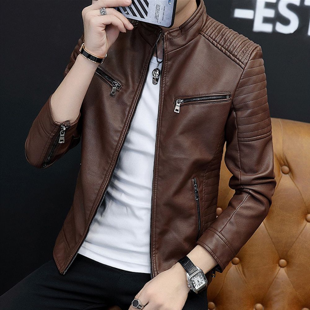This men's genuine leather jacket with the traditional Brando biker design has quilted shoulders that give warmth and flair. The jacket's various pockets make it easy to stow necessities, and its stand-up collar gives it a little of edge. The leather's natural texture and deep brown hue recall a timeless elegance that gives your outfits a unique touch.