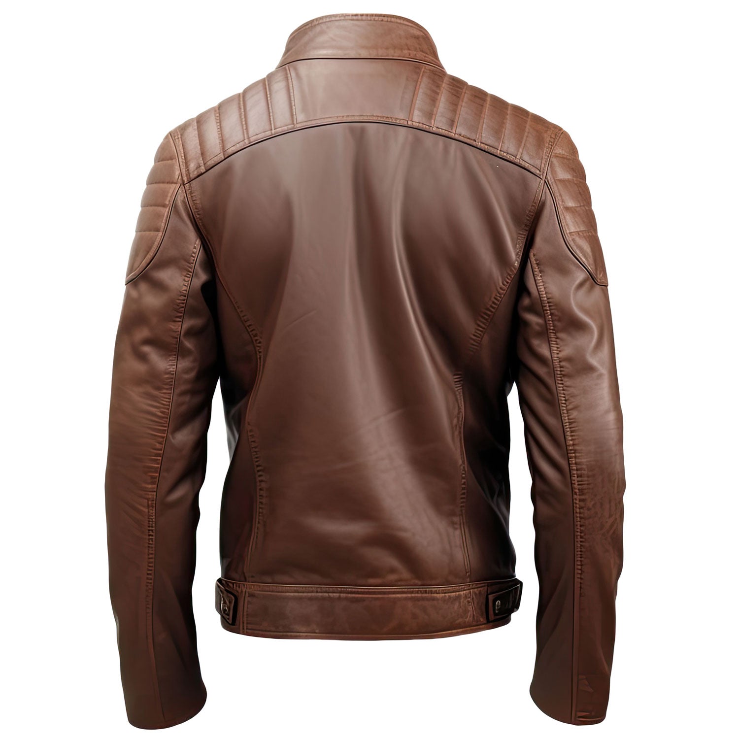 The men's distressed leather jacket has multiple pockets, including four zipped front pockets, to keep your essentials. The quilted shoulders and sleeves detailing add texture to the design, offering a soft and cozy feel. The adjustable waist belt provides a custom fit, offering a blend of comfort and style. The jacket’s interior is lined with a velvety soft material that feels smooth to the touch.